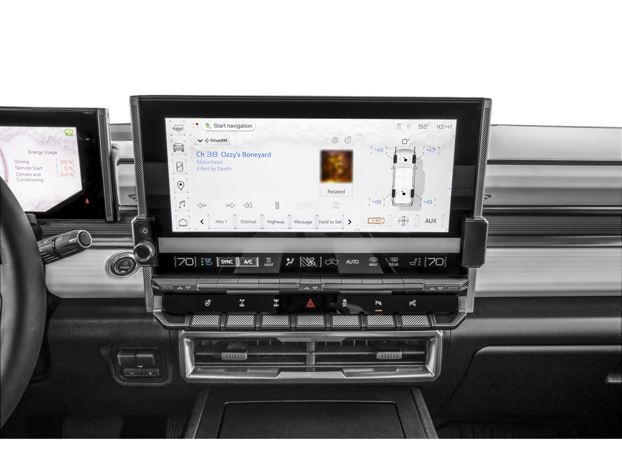 10.49 Final Drive Ratio, 12-Way Power Driver Seat Adjuster, 12-Way Power Passenger Seat Adjuster, 14 Speakers, 24 Module Battery Pack, 4-Wheel Disc Brakes, ABS brakes, Adaptive suspension, Air Conditioning, All-Weather eTrunk Mat (LPO), Alloy wheels, AM/FM radio: SiriusXM with 360L, Apple CarPlay/Android Auto, Auto High-beam Headlights, Auto-dimming door mirrors, Auto-dimming Rear-View mirror, Automatic temperature control, Bose Centerpoint Premium 14-Speaker Surround Sound, Brake assist, Compass, Container - Lockable Storage (LPO), Delay-off headlights, Driver door bin, Driver vanity mirror, Dual front impact airbags, Dual front side impact airbags, Electronic Stability Control, Emergency communication system: OnStar, Exterior Parking Camera Rear, Four wheel independent suspension, Front & Rear Air Ride Adaptive Suspension, Front anti-roll bar, Front Bucket Seats, Front Center Armrest, Front dual zone A/C, Front reading lights, Garage door transmitter, Heated door mirrors, Heated Driver & Front Passenger Seats, Heated front seats, Heated rear seats, Heated steering wheel, Illuminated entry, Low tire pressure warning, Memory seat, Navigation System, Occupant sensing airbag, Outside temperature display, Overhead console, Panic alarm, Passenger door bin, Passenger vanity mirror, Power door mirrors, Power driver seat, Power passenger seat, Power steering, Power windows, Preferred Equipment Group 1SD, Premium Front Bucket Seats w/Center Console, Premium Leather-Alternative Seating Surfaces, Radio data system, Radio: AM/FM Audio System, Rain sensing wipers, Rear air conditioning, Rear reading lights, Rear seat center armrest, Rear window defroster, Remote keyless entry, Security system, SiriusXM w/360L, Speed control, Speed-sensing steering, Split folding rear seat, Steering wheel memory, Steering wheel mounted audio controls, Telescoping steering wheel, Tilt steering wheel, Traction control, Trip computer, Variably intermittent wipers, Ventilated Driver & Front Passenger Seats, Ventilated front seats, Wheels: 22 x 9.5 Premium Finish Painted Aluminum, Wireless Phone Projection.